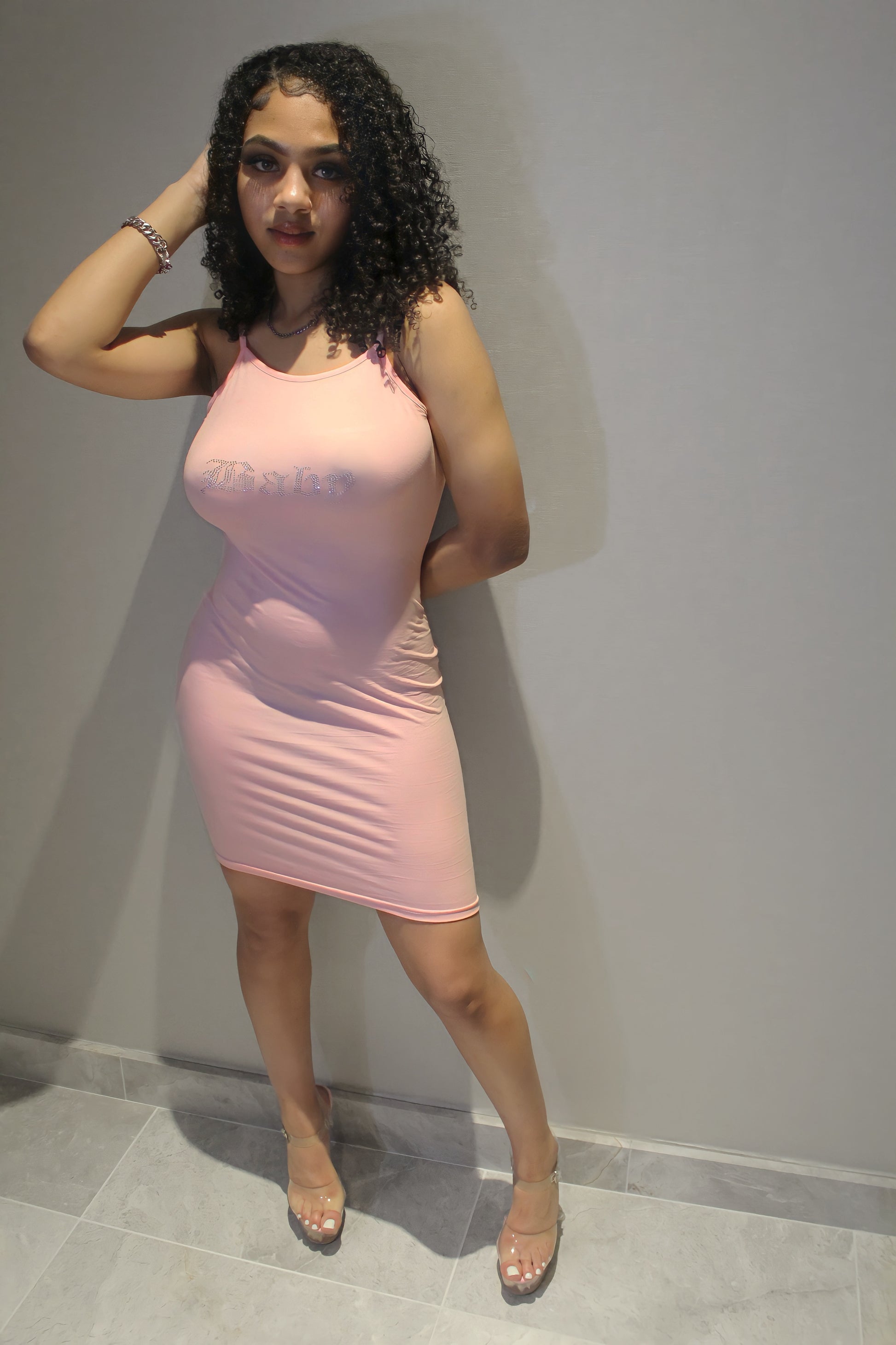 Jersey stretch dress with rhinestone print. Available to order now.